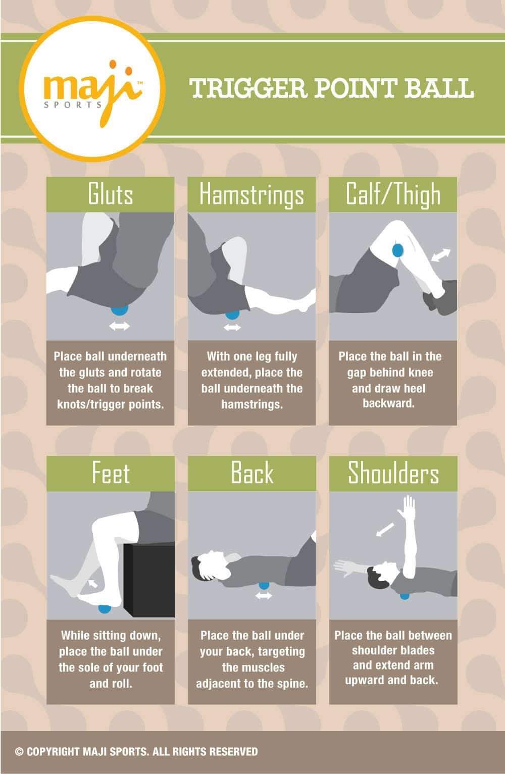 - This Trigger Point Ball is beneficial in targeting muscles of the back, neck, hips, thighs, hamstrings, calves, chest, piriformis and gluts: targeting of these muscles is best done when you lie down on the trigger point ball, pitching it between the desired targeted muscle and the wall or floor. It will take a bit of practice to figure out how best to maximize pressure effectively to muscles and the relieve of muscular tension.